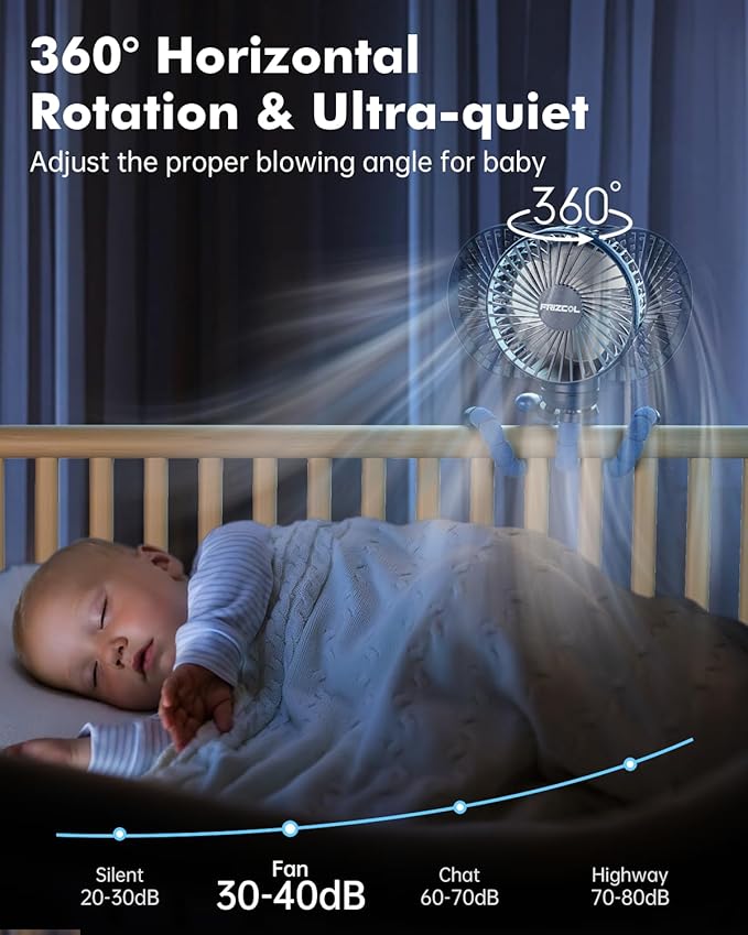 - 【Baby Friendly】- ①Soft wind: Switch between 3 wind speeds with one click, the breeze can better care for your baby's health. ②Fan cover specially designed to protect curious little fingers with <5mm spacing for peace of mind. ③Brushless motor design, the noise is lower than 25dB, allowing your baby to improve sleep quality.
