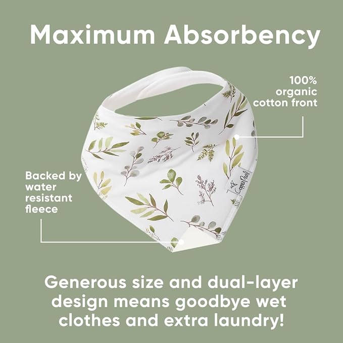 - MAXIMUM ABSORPTION: Fronted by ultra-soft Organic Cotton and lined with water-resistant polyester fleece to provide an extra layer of absorbency. Each bib is crafted with dual-layer protection against heavy drooling or spit-up, keeping your baby dry and comfortable.