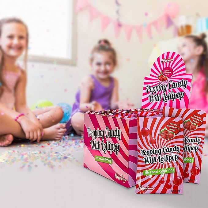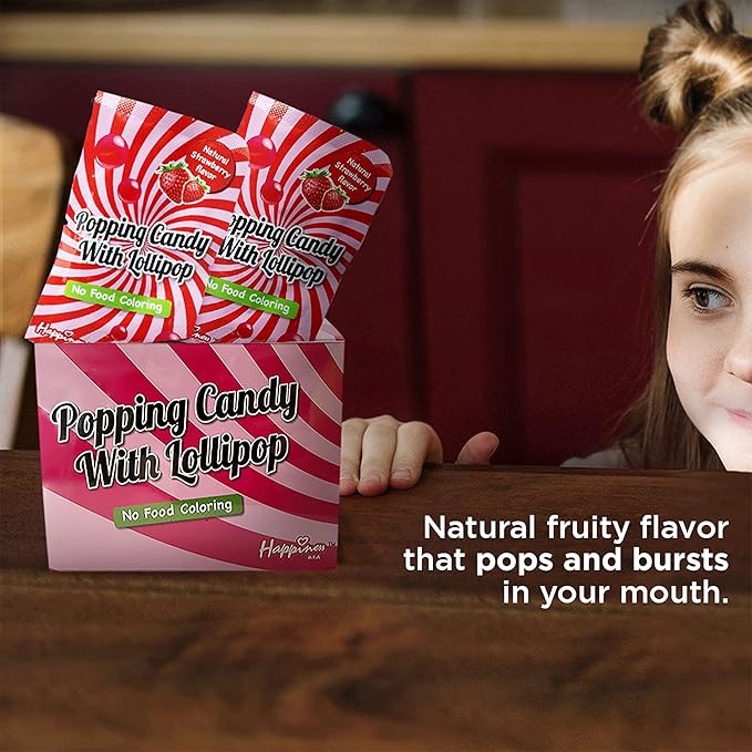 - A DELICIOUS & FUN TREAT: The Happiness Popping Candy with Lollipop is a thrilling & tasty fun size candy experience! Each individually wrapped candy contains a total of 11 grams of candy rocks & a lollipop, bursting with a delightful strawberry flavor.
