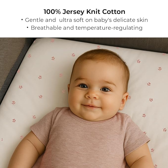 - Perfect Gift for Baby Girls: Bundled in charmingly cute and compact packaging, this 2-pack sheet set makes for the perfect baby shower gift. Include this breathable, and soft Pack n Play sheet set in Pink Tulip Collection to your gift registry, ensuring comfort and style for the newest addition to your family.
