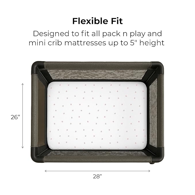 - Flexible Fit for Standard Pack n Play and Mini Crib Mattresses: Our sheets, sized at 38”x24”x5”, feature an innovative elastic band for adaptable stretch and a secure fit. Designed for standard Pack and Play mats (39”x27”x0.5”), portable, and mini crib mattresses (38”x24”x3”), the elastic ensures the sheet stays snugly in place on mattresses up to 5 inches thick. Compatible with Graco Pack n Play and other standard playards and playpens, it provides a smooth, safe surface for your baby.