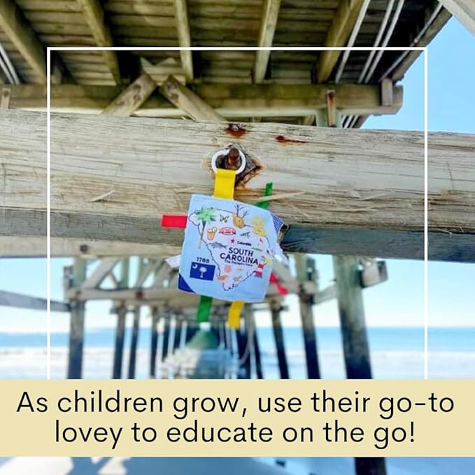Baby Jack & Co 8x8” Learning Lovey South Carolina State Tag Stroller Toy for Babies - Crinkle Toys for Developing Five Senses - Learn About Capitals - Travel with Baby Jack - BPA Free Clip