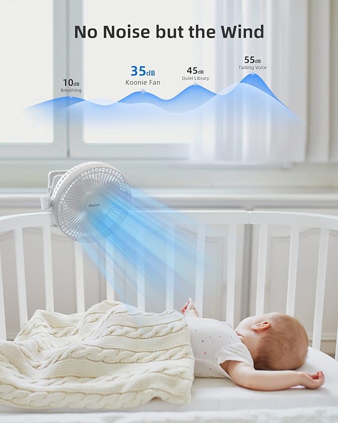 Koonie Portable Clip on Fan, 8-Inch 10000mAh USB Rechargeable Battery Operated, 4 Speeds, Strong Airflow, Sturdy Clamp for Office Desk Golf Car Outdoor Travel Camping Tent Gym Treadmill