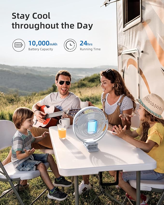 - Powerful Battery Capacity This rechargeable fan comes along with a 10000mAh battery that even can last up to 24 hours when fully charged. It is convenient to use the battery operated fan so you’ll never have to fuss with wires or cords.
