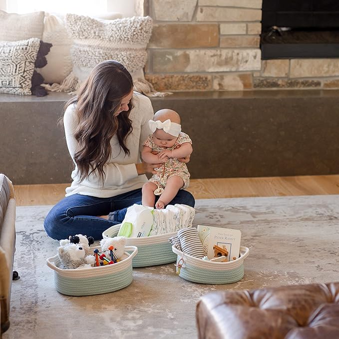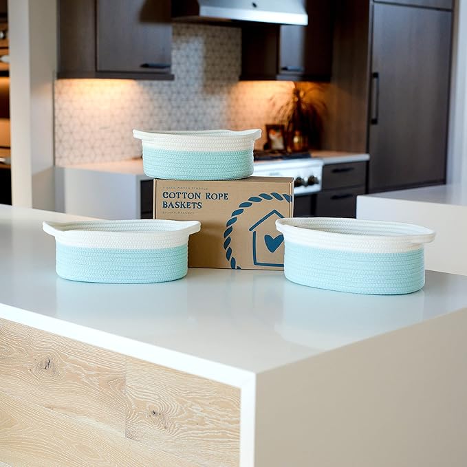 NaturalCozy 3-Piece Oval Storage Basket Set– Soft Natural Rope Woven Baskets for Storage Shelf, Toy, Nursery, Gift, Baby Shower, Pets Cat Dog Bins | Small Basket for Organizing (Off White Turquoise)