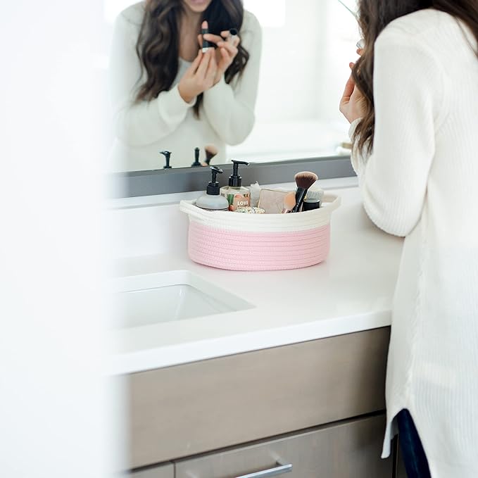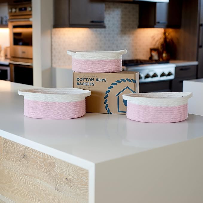 NaturalCozy 3-Piece Oval Storage Basket Set– Soft Natural Rope Woven Baskets for Storage Shelf, Toy, Nursery, Gift, Baby Shower, Pets Cat Dog Bins | Small Basket for Organizing (Off White & Pink)