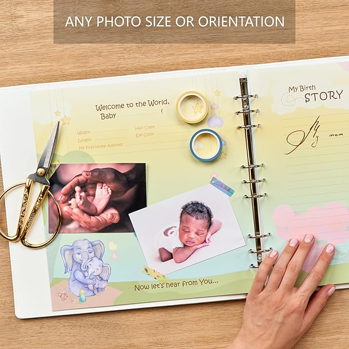 - Faux Leather Cover – Durable, attractive 12" X 12" leather-bound elephant baby album and memory book for boys and girls; 60 pages to keep your precious memories, from baby shower to age 5.