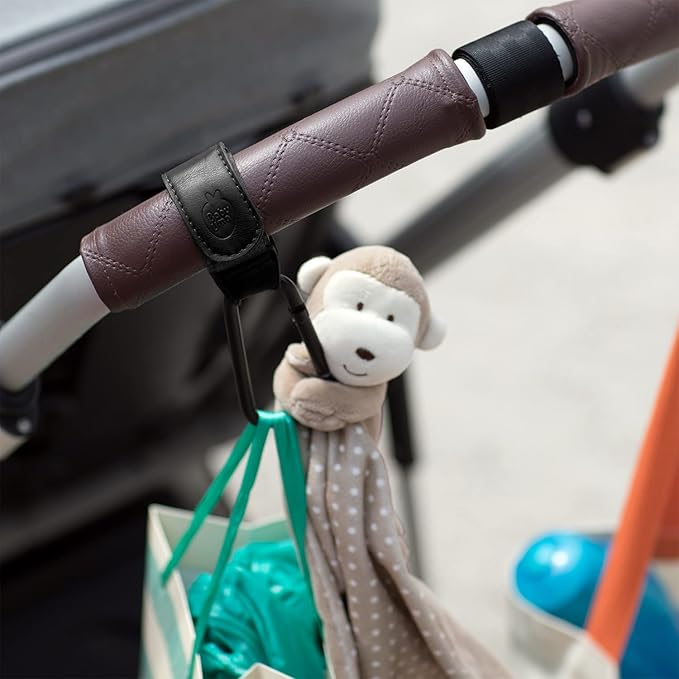 - CARRY 4 EXTRA BAGS: Sturdy yet lightweight, the beautiful mommy hook combines a faux leather strap with matte black carabiners. Each stroller carabiner clip can handle 11 lbs with ease!