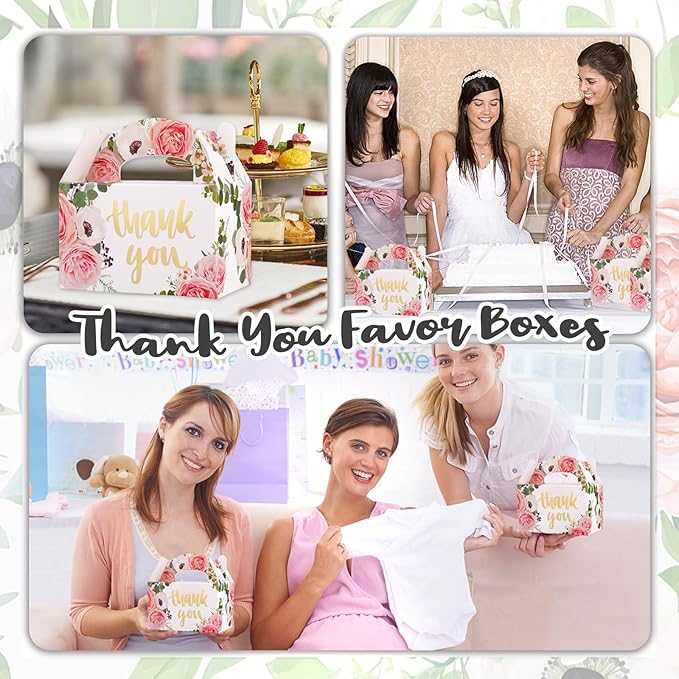 - 【Perfect Treat Boxes 24 Pack Set】 - 24 pack thank you floral favor gift boxes with pastel and romantic designs, make your gift more unique. Large quantities that are sufficient to meet your needs for party favors. Size 6.3 x 3.54 x 3.54 inch (Height is 7.7 inches if handle is included). Perfect size and shape for small gifts and homemade cupcakes. The Gable Boxes are flat, pre-folded for easy folding and assembly. If you don't need to use it, pls open the package and lay it flat for storage.