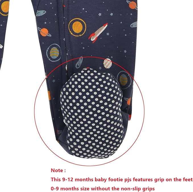 - 【Built-in Mittens and Footed】All sizes design with reversible mitten hand covers to prevent baby from scratching themselves. This 9-12 months baby footie pjs features grip on the feet for extra stability. Great for little baby on the move(0-9 months size without non-slip grips)