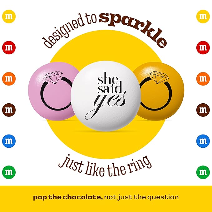 - SAY YES TO THIS BLEND! Contains 2 pounds of M&M'S white, pink and gold candy bulk with engagement-themed graphics printed directly on the chocolate