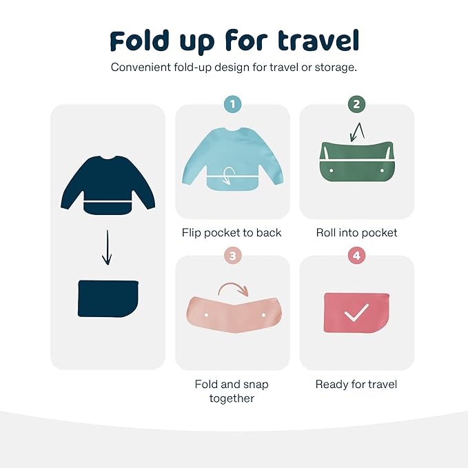 - TRAVEL BUDDY:TRAVEL BUDDY:The must-have baby feeding essentials for on-the-go parents! Our long sleeve waterproof smock bib (fits 6-24 months) is a versatile wipeable bibs with scratch-free closures and 360 degrees puree-proof protection.This bib with sleeves is perfect for plane or car meals, It folds flat in diaper bags,handles baby-led weaning messes and makes a great gender-neutral baby shower gift.Ideal for parents needing baby eating essentials on the go.
