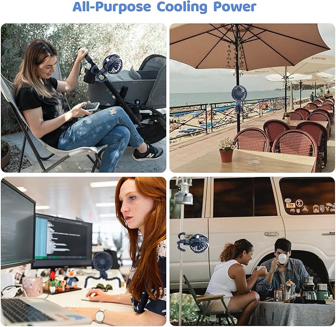 - Versatile and Portable:-Compact , Lightweight。Small size and foldable tripod, put this mini stroller fan inside in your backpack easily.It would be a good partner for you when travelling, cycling, camping , stroller walking,。Useing in desk, outdoor, beach, BBQ, car seat, baby table, crib. To meet all your cool needs in hot summer.