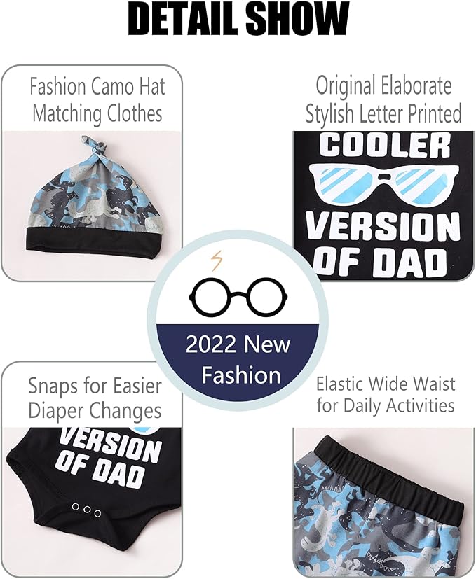 - Unique design –Baby boy romper top with botton opening for easy wear . "COOLER VERSION OF DAD"Letter printed and colorfal glasses stylish bring impressive and eye-catching feelings . Elastic waistband Dinosaur long pants make for easy dressing and bring convenience for movement.It also has a hat for your boy . Your boy will be the handsome one.
