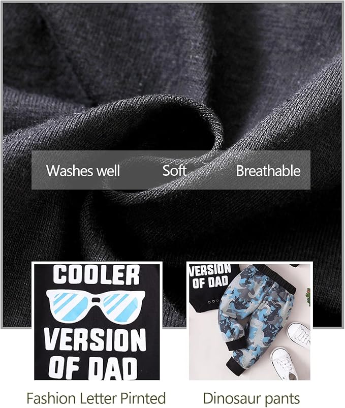 - Unique design –Baby boy romper top with botton opening for easy wear . "COOLER VERSION OF DAD"Letter printed and colorfal glasses stylish bring impressive and eye-catching feelings . Elastic waistband Dinosaur long pants make for easy dressing and bring convenience for movement.It also has a hat for your boy . Your boy will be the handsome one.