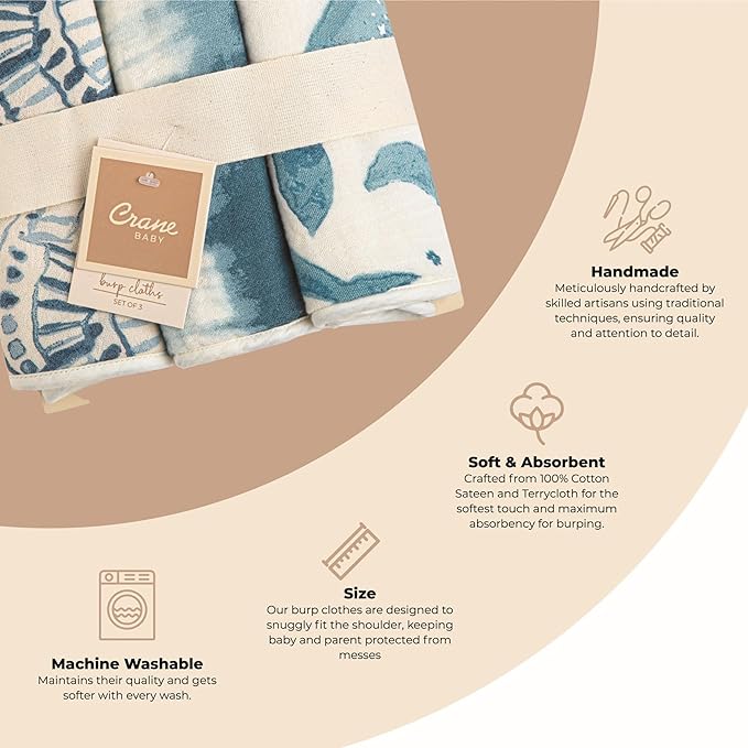 - Cotton Muslin Burp Cloths - Made from 100% Cotton, These Muslin Burp Cloths Feature a Terry Cloth Backing for Added Comfort and Absorbency, Making Crane Baby Burp Cloths a Newborn Baby Essentials Item
