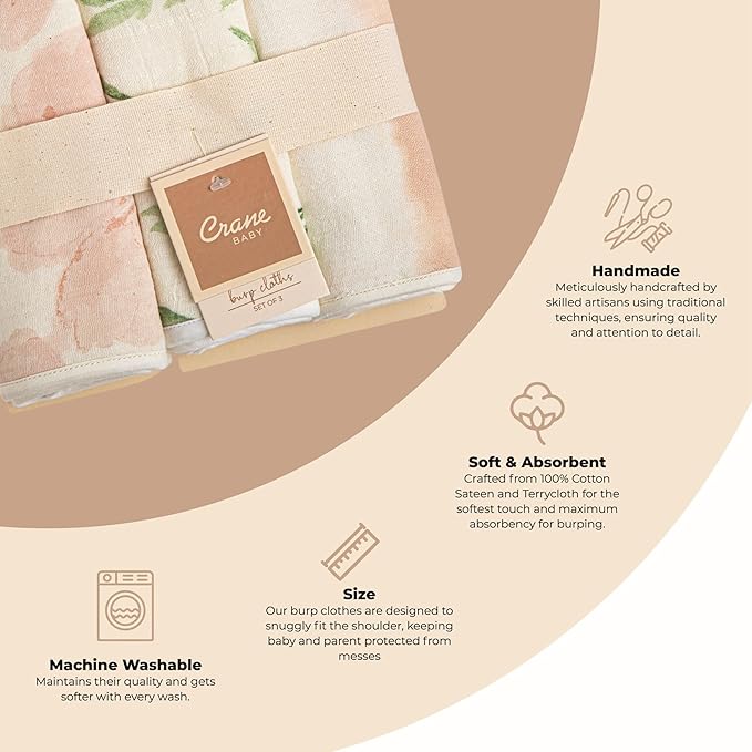 - Cotton Muslin Burp Cloths - Made from 100% Cotton, These Muslin Burp Cloths Feature a Terry Cloth Backing for Added Comfort and Absorbency, Making Crane Baby Burp Cloths a Newborn Baby Essentials Item