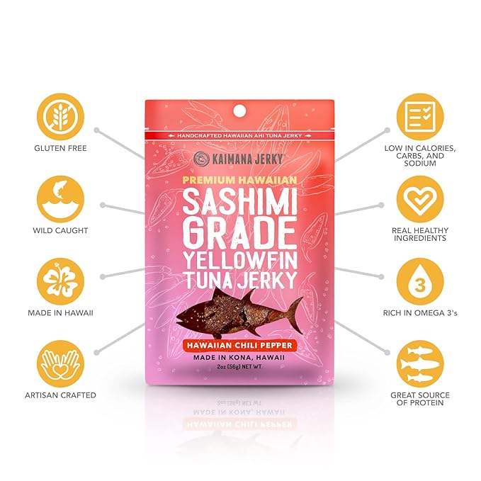 - Hawaiian Chili Pepper: Kaimana's most requested flavor. Marinated in brown sugar, preservative-free soy sauce, and then seasoned with our delicious organic spice blend that includes garlic, red chili, sesame seed oil, and black pepper. The 2 oz resealable bag is perfectly sized for snacking on-the-go.