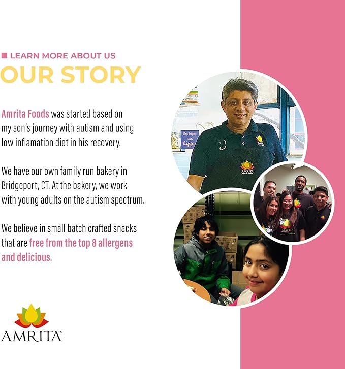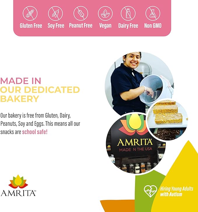 - The Amrita Promise - Enjoy our vegan snacks, crafted in small batches in our allergen-free family-run bakery. We proudly support young adults with autism through our hiring practices and stand by our products.