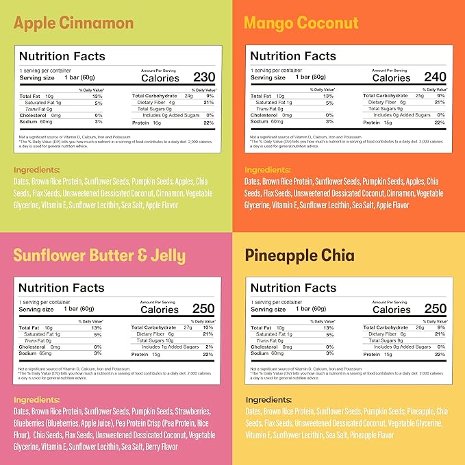 - 12+ Superfoods in Every Bar – Our bars pack indulgent flavor with healthy ingredients like Dates, Brown Rice Protein, Sunflower Seed Butter, Pumpkin, Chia & Flax Seeds, Unsweetened Coconut, Apples, Blueberries, Mango, Strawberries, Maca and Puffed Quinoa for nutrient-rich snacking.