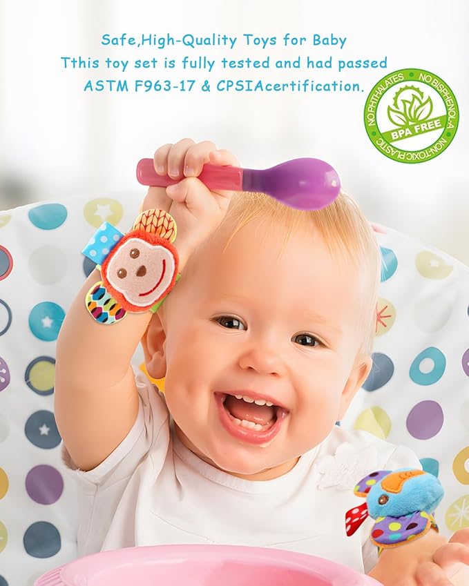- MULTIPLE TYPES -- This toy set contain 4 types: wrist rattles, foot finder socks, hand rattle and hanging rattle. Babies can play at different ages and in different places.