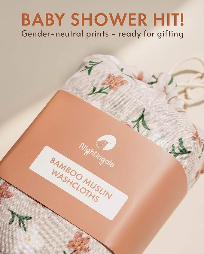 Nightingale Baby Washcloths, Rayon from Bamboo Baby Clothes Organic Wash Cloths with Cotton, Newborn Bath Essentials, Burping Cloths for Babies, Face Towels Reusable 12"x12" (Floral) 6 Pack