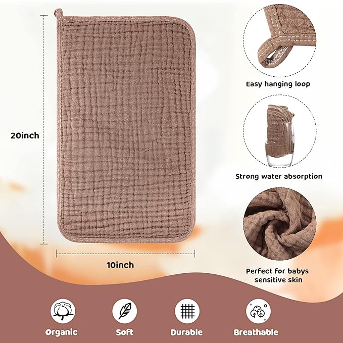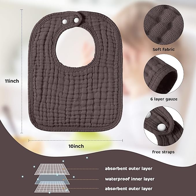 - 6 Absorbent Layer Design: each muslin burp cloths has 6 layers, thick enough to absorb liquids and easily wipe away sweat and water, providing a comfortable use that will keep chin dry and the soft material will guard teething cheeks