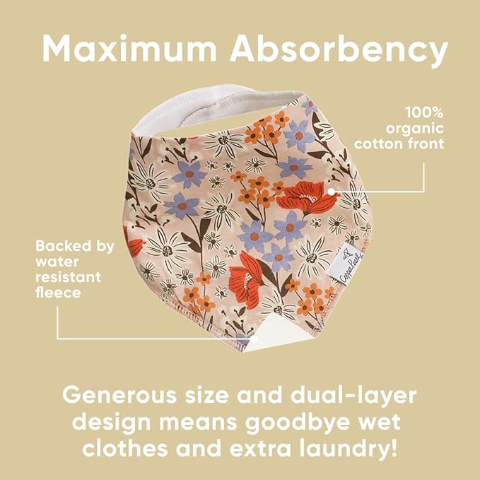 - MAXIMUM ABSORPTION: Fronted by ultra-soft Organic Cotton and lined with water-resistant polyester fleece to provide an extra layer of absorbency. Each bib is crafted with dual-layer protection against heavy drooling or spit-up, keeping your baby dry and comfortable.