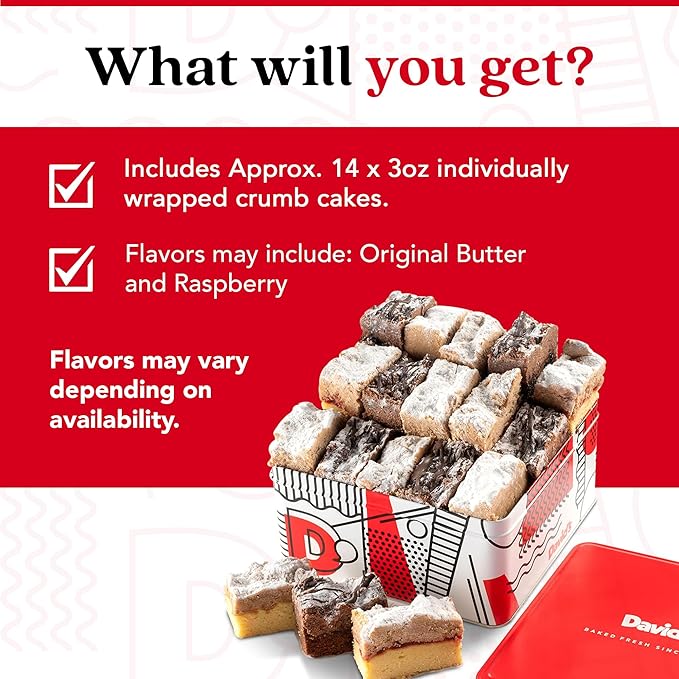 David's Cookies Fresh Baked Gourmet Crumb Cake Food Gift Basket - Gourmet Crumb Cake Assortment With Original Butter, Raspberry Gift Basket - Ideal Gift for Corporate Birthday Fathers Mothers Day Get Well and Other Special Occasions - 2 lb (14 pcs)