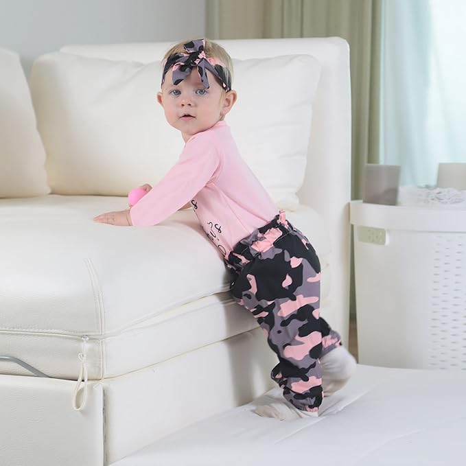 - Cute Baby Girl Camo Outfits---Ruffled layered shoulder, camouflage pants with elastic waist, matching bowknot headband, adorable 3 pcs spring fall winter baby camo clothing girls.