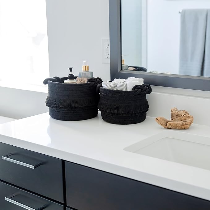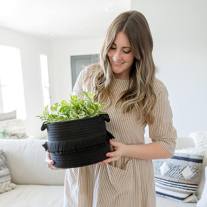 NaturalCozy 3-Piece Decorative Storage Basket Set – Black Cotton Rope Small Woven Baskets for Organizing for Nursery Baby Stuff, Gift, Vanity, Montessori, Dog Cat Toy Bin, Planter, Bathroom Shelves