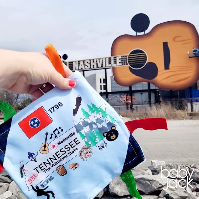 Baby Jack & Co 8x8” Learning Lovey Tennessee State Tag Stroller Toy for Babies - Crinkle Toys for Developing Five Senses - Learn About Capitals - Travel with Baby Jack - BPA Free Clip