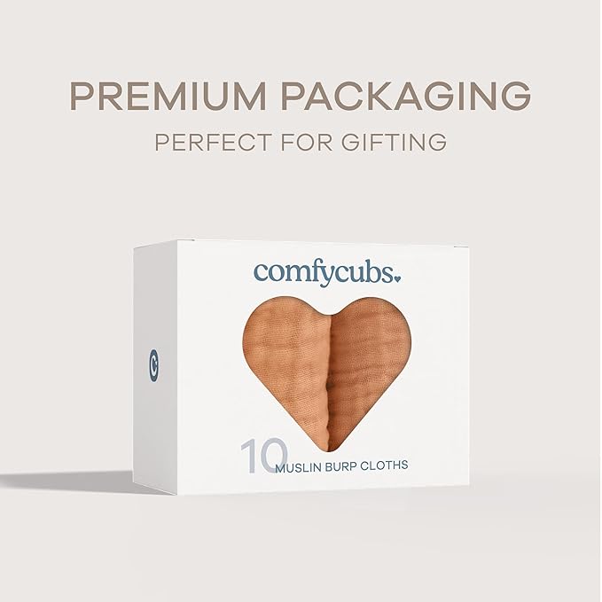 Comfy Cubs Muslin Burp Cloths 20" x 10", Pack of 10 - Large, 6-Layer, Ultra Absorbent 100% Cotton for Baby Drool and Messes - Soft, Safe & Gentle Baby Burp Cloths for Boys & Girls - Caramel