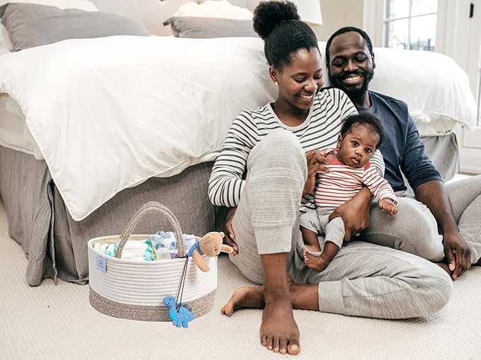Baby Extra Large Cotton Rope Diaper Caddy, Organizer Storage Bin for Nursery Essentials, 100% Natural Cotton Eco friendly, Organizer with Removable Divider (White & Brown)