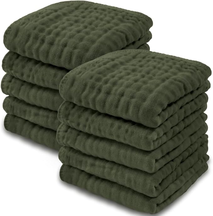 Comfy Cubs Muslin Baby Washcloths 10 Pack - Soft 6-Layer Cotton Wash Cloths for Sensitive Skin - 10"x10" Large, Gentle, Absorbent Infant Essentials for Newborn and Toddlers - Kelp