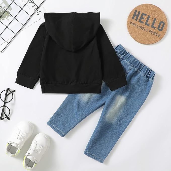 - Eye Catching Design - Toddler boy clothes outfits set have hoodie sweatshirt with letter print,matching denim elastic pants are easy to dress and bring convenience for movement.