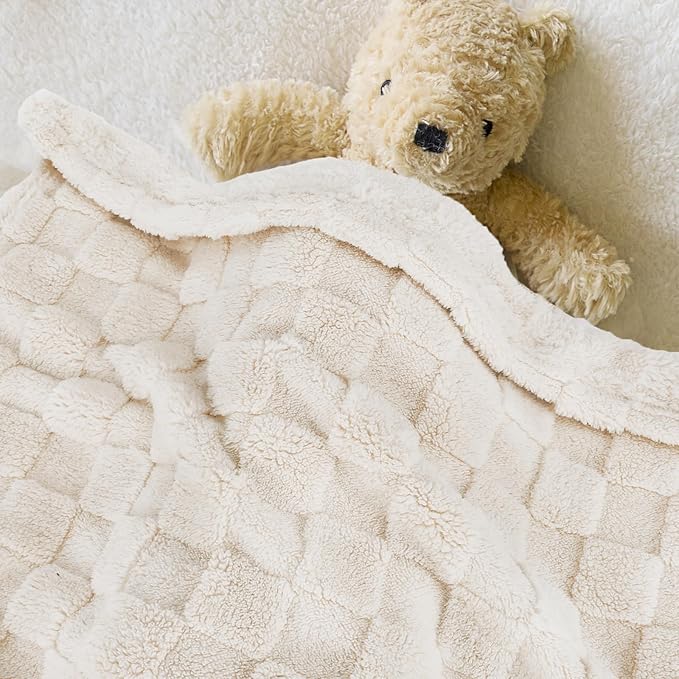 HOMRITAR 3D Gingham Fleece Baby Blanket for Girls Boys Chessboard Grid Warmer Comfort Reversible Shaggy Cozy Decor for Home Bed Blanket for Toddlers 30 x 40 Inches Cream