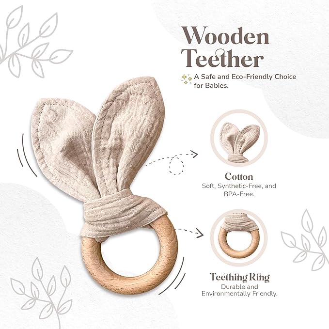 - [FOR LITTLE EXPLORERS]- The long bunny ears of the breathable lovey and its carefully sewn cloth ends are perfect for grabbing and playing. The teething ring made of untreated wood with matching rabbit ears is ideal for biting and suckling.