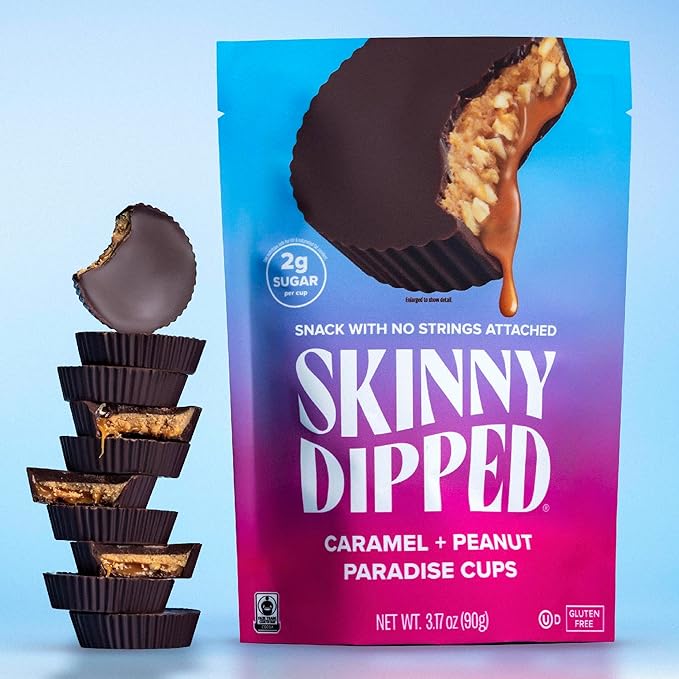 - 24 CUPS TOTAL: Includes (4) 3.17oz Bags of SkinnyDipped Chocolate Candy Cups. Each bag contains (6) individually wrapped cups.