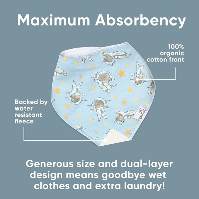 - MAXIMUM ABSORPTION: Fronted by ultra-soft Organic Cotton and lined with water-resistant polyester fleece to provide an extra layer of absorbency. Each bib is crafted with dual-layer protection against heavy drooling or spit-up, keeping your baby dry and comfortable.