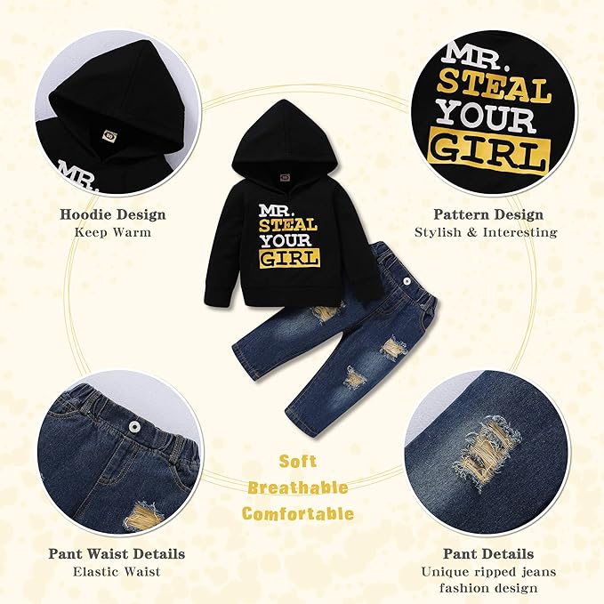 • Eye Catching Design - Toddler boy clothes outfits set have hoodie sweatshirt with letter print,matching denim elastic pants are easy to dress and bring convenience for movement.