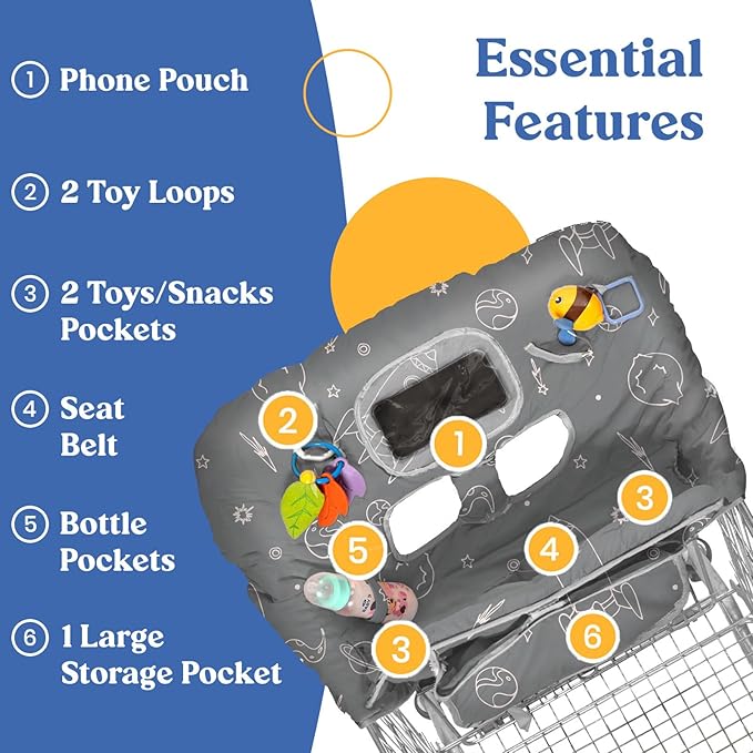 - 🛒Premium Quality for Ultimate Comfort: Prioritizing your baby's convenience, our cart cover for babies is made with soft & breathable fabric at the front, a cushy anti-slip suede fabric on the sides, and a squishy yet sturdy bottom cushion for the grocery cart baby seat. We used a comfortable cotton cover with a thick cotton filling for high sitting support with extra padding to make your baby feel cozy. It's hand & machine washable at 40 degrees without color fading, ripping, or falling apart
