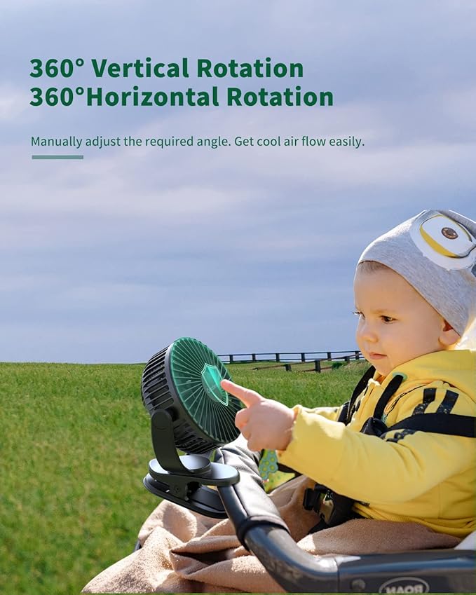 - Battery Powered Fan - The head of this clip fan is flexible and can be rotated 360 degrees vertically and horizontally, so we can direct the air as we like. There is non-slip silicone on the bottom of the rechargeable fan, it will not scratch the desktop, and it can stand firmly on the desktop even in the super wind mode.