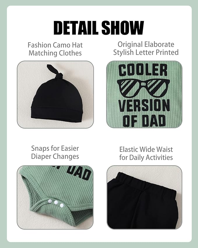 - Eye Catching Design - Baby boy romper with letter print,matching elastic pants and a cute hat are easy to dress and stylish.