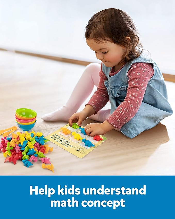 - Sensory Motor Development: The fun sorting dinosaur game helps teach colors, different dinosaurs, and counting. Perfect for preschoolers or kindergartners to learn early mathematics, color perception, hand-eye coordination, patterns, sorting, strengthening pincer grasp, etc
