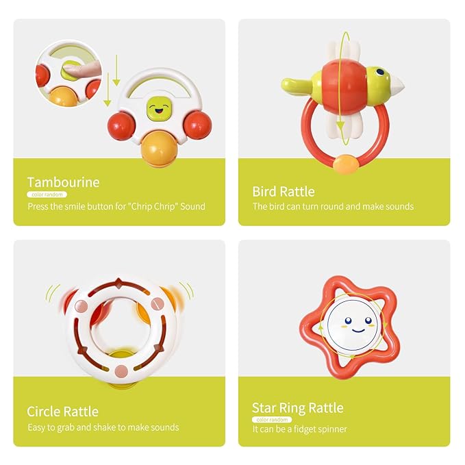 - Each baby rattle has different grip, cute shape, bright color, funny sounds and soft silicone teether to meet the needs of babies in different development stages