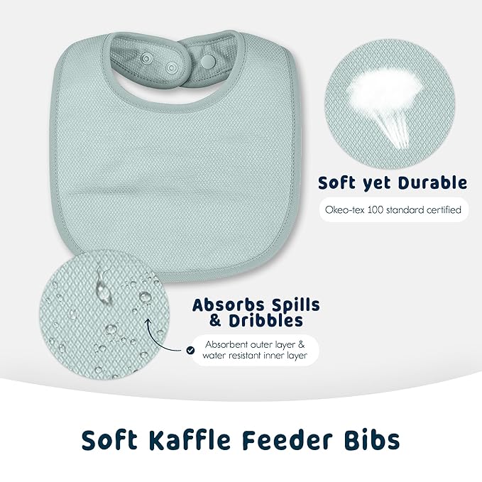 - MESS-PROOF FEEDING SOLUTION: Designed for intense drooling stages and baby-led weaning (BLW) ,Our machine washable Kaffle fabric softens progressively with each wash. As a baby registry must-have, Its intelligent design combines OEKO-TEX certified safety with mess containment trusted by pediatricians.