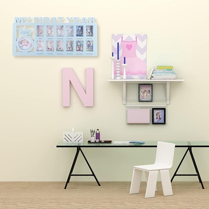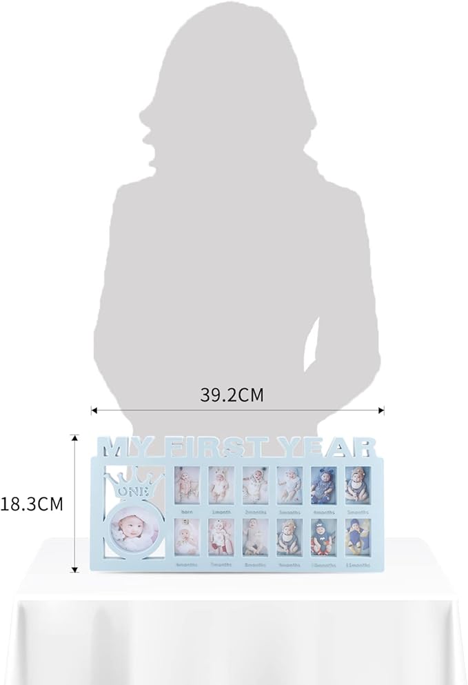 - Holds 13 Photos- 1 photo for each month (totally 12 pieces) + 1 memorable photo; the overall size of the baby first year picture frame is approx. 16 x 8 x 1 inch, the rectangular photo slot is approx. 2.2 x 1.4 inch and the round photo slot is about 2.8 inch in diameter