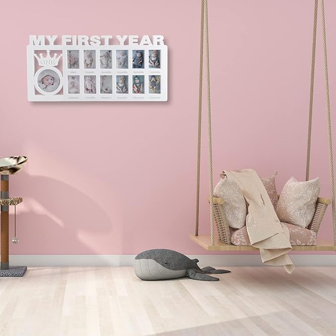- Holds 13 Photos- 1 photo for each month (totally 12 pieces) + 1 memorable photo; the overall size of the baby first year picture frame is approx. 16 x 8 x 1 inch, the rectangular photo slot is approx. 2.2 x 1.4 inch and the round photo slot is about 2.8 inch in diameter