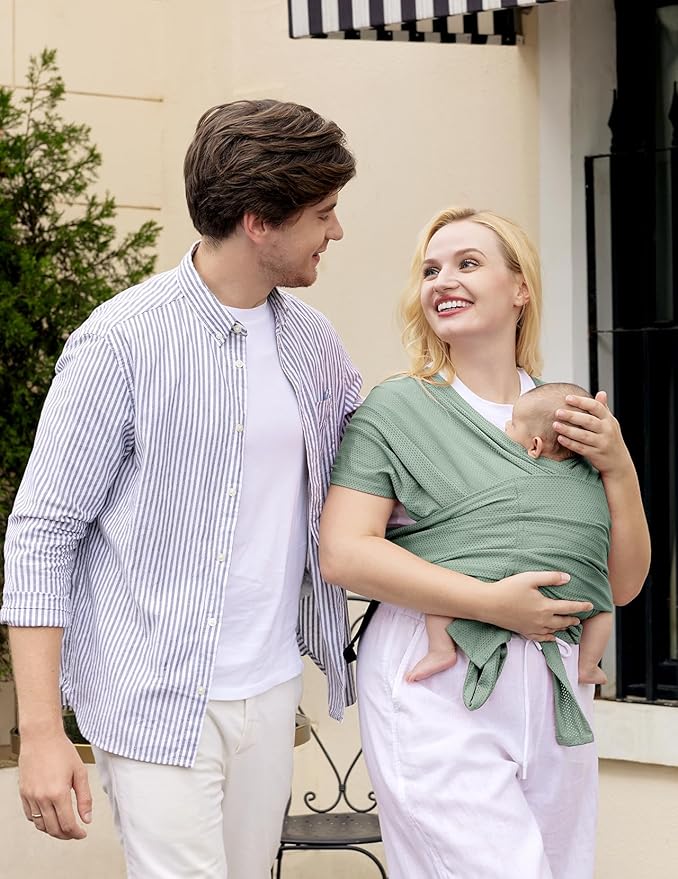 Momcozy Adjustable Buckle Baby Wrap Carrier Cooling Air-Mesh, Easy to Wear Baby Carrier Sling, Baby Carriers Newborn to Toddler 8-35lbs, Suit for Waist 47-57inch,Plus Size Grey Green